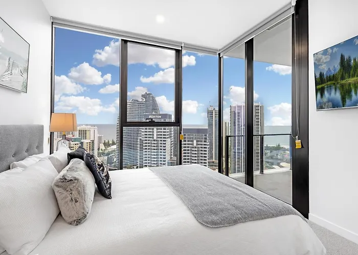 The spacious 87 m² Lamour Ocean View Apartment I In Casino Broadbeach - Free Parking is about 7 km from AquaSplash Inflatable Water Park and boasts spa facilities such as a sauna. Offering an outdoor pool area, the 2-bedroom apartment is located not too far from The Oasis Shopping Centre.